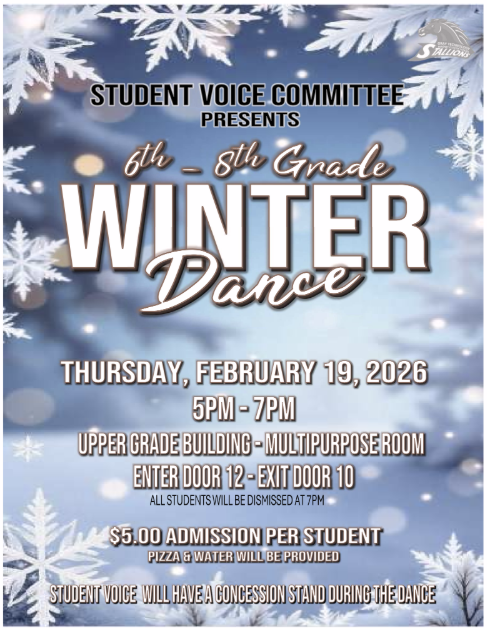 Admission is $5. Payments can be made in the Uppergrade Building office during lunch, recess, or after school. Sales open this Monday and run through the day of the dance (February 19th).